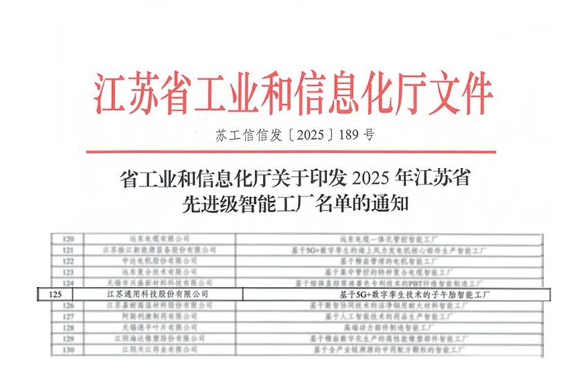近日,江蘇省工業(yè)和信息化廳正式公布2025年江蘇省先進(jìn)級智能工廠名單,通用股份榮耀上榜。這一榮譽(yù)不僅是對通用股份前瞻創(chuàng)新實(shí)踐的高度認(rèn)可