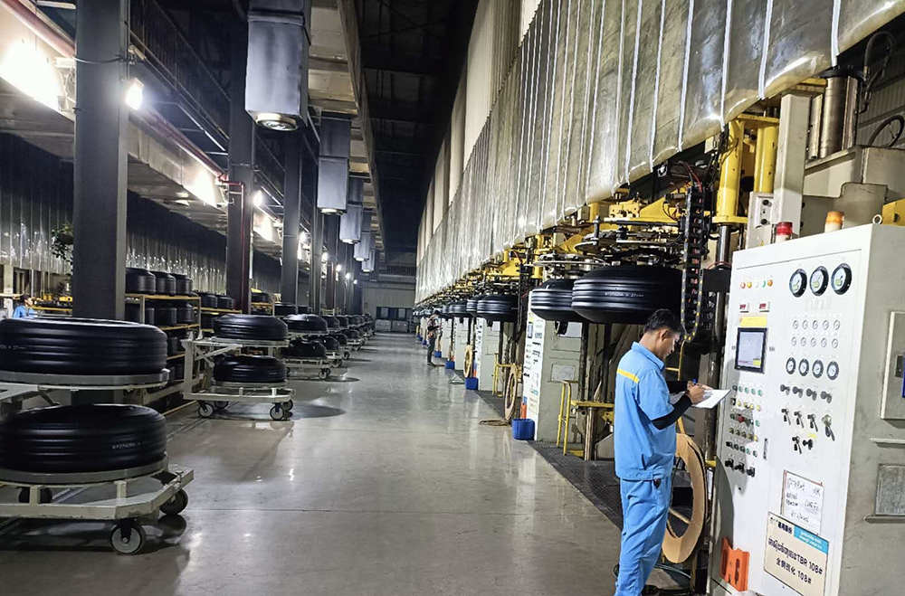 隨著夜幕降臨,通用股份柬埔寨工廠卻燈火通明,智能生產線高效運轉、火力全開,一條條高品質輪胎正源源不斷的完成生產入庫。放眼廠外,滿載高品質輪胎的貨車排起長龍、整裝待發,即將把這些高品質輪胎送到美國、歐洲等世界各地的客戶手中。